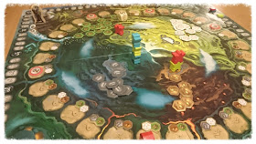 Da wäre der Druide! Jedesmal wenn eine Hütte gebaut wird, bewegt sich der Druide zur nächsten Hütte oder Siedlung. Nun beginnt das Opferritual: Bei einer freistehenden Hütte, kann der Spieler eine bei der Hütte angezeigten Rohstoff opfern um 1 Siegpunkt zu erhalten. Opfert der Spieler nichts, da er beispielsweise geforderten Rohstoff nicht hat bekommt er einen Minuspunkt. Bei einer Siedlung (mehrere Hütten zusammengeschlossen) kann der Spieler zwei geforderte Rohstoffe opfern. Dann bekommt er so viele Siegespunkte, wie Hütten in dieser Siedlung stehen! Stehen mehrere Hütten nebeneinander wird das Ritual des Druiden bei der nächsten Hütte wiederholt, bis er zum Ende der Siedlung angelangt ist.